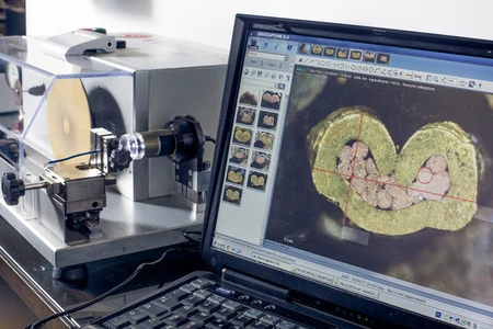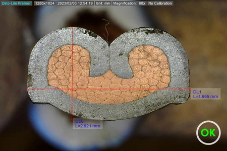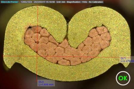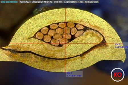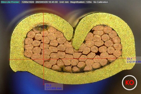 Il laboratorio di micrografia è in grado di misurare e valutare facilmente il risultato di crimpatura attraverso degli scatti fotografici della superficie tagliata. Dopo il taglio e una pulitura chimica il risultato fotografico viene analizzato tramite software con la possibilità di effettuare misurazioni microscopiche dei trefoli crimpati.